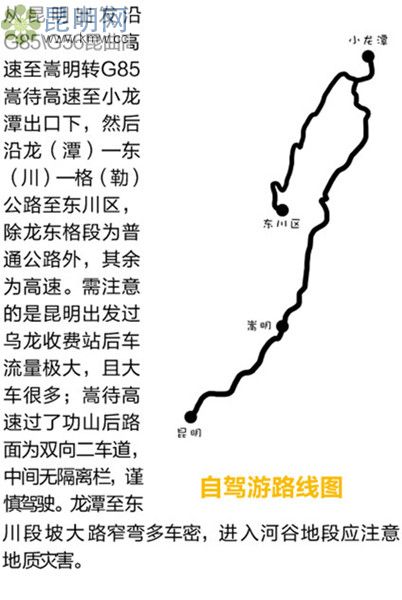 從昆明出發(fā)沿G85/G56昆曲高速至嵩明轉(zhuǎn)G85嵩待高速至小龍?zhí)冻隹谙,然后沿龍(潭?mdash;東(川)—格(勒)公路至東川區(qū),除龍東格段為普通公路外,其余為高速。需注意的是昆明出發(fā)過烏龍收費站后車流量極大,且大車很多;嵩待高速過了功山后路面為雙向二車道,中間無隔離欄,謹慎駕駛。龍?zhí)吨翓|川段坡大路窄彎多車密,進入河谷地段應注意地質(zhì)災害。