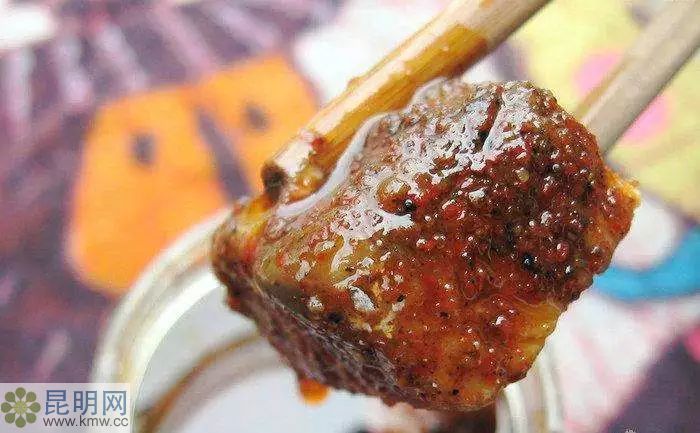 在建水紅火的夜市燒烤排擋里,少不了包漿豆腐的身影。豆腐們伏在燒烤架上,貌不驚人。幾分鐘后,包漿豆腐開始歡歌了,一塊塊“噗噗”地冒著熱氣,爭先恐后地炫耀自己逐漸膨脹、一戳即破的身體,外皮也變得金黃。這時候蘸上鹵腐汁等配料,香氣便開始泛濫。